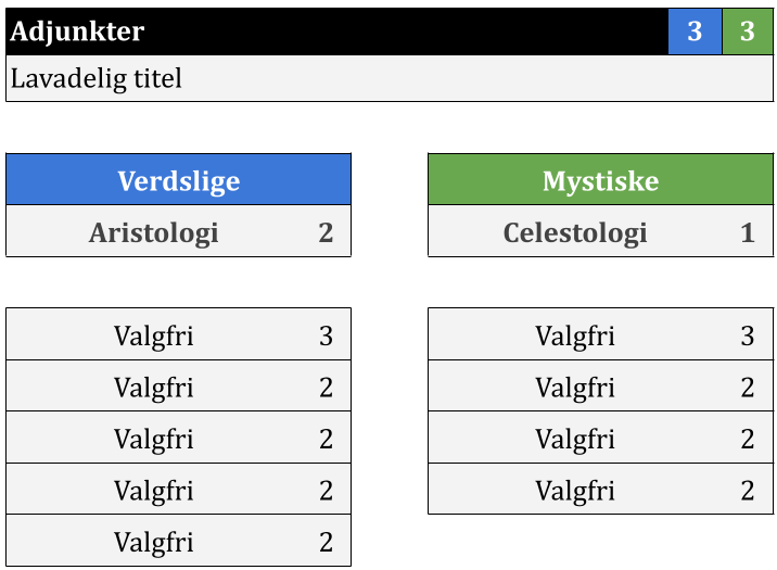 - Personen bærer en af følgende titler: Advisør, Artíst, Diplomat, Drost, Foged, Forvalter, Førsteridder, Gesandt, Heraldist, Herold, Hofadvisør, Kansler, Konsul, Kurator, Livridder, Mæcén, Notar, Ridder, Rigsadvisør eller Stormester. Bemærk, at hvis Adjunkten senere mister den forudsatte titel, så mister vedkommende også sin titel som Adjunkt.